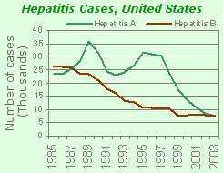 Between 1987 and 1997, hepatitis A was a general population disease most commonly found among children, especially those living throughout the American west, southwest, the southern plains and Alaska.PPP Hepatitis A peaked at 35,822 cases in 1989. But when a vaccine became routinely administered in the 1990’s, the number of cases dropped significantly. Only 7,653 cases were reported in 2003.QQQ